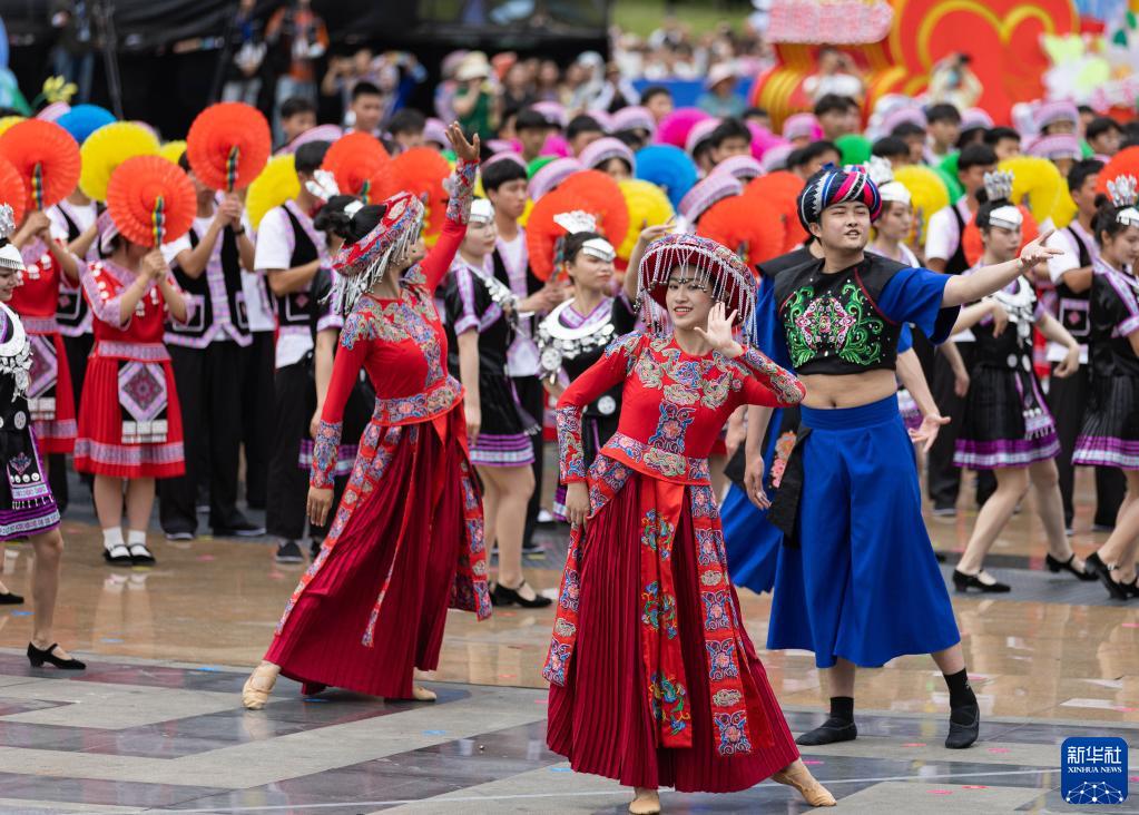 當日,四川省級非遺“興文苗族花山節”展示傳承活動在四川省興文縣市民廣場舉行。活動上融入傳統祭祀、農耕文化、民族團結等內容的展演和苗家長桌美食宴,讓賓客感受到熱烈的節日氛圍。