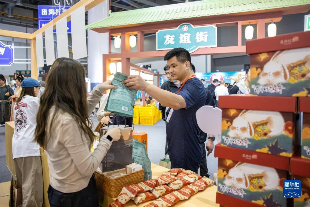 4月20日,參觀者在茶顏悅色展區購買商品。