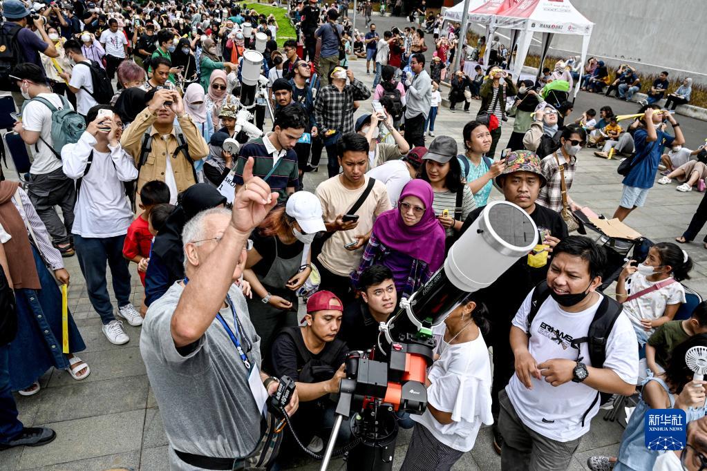 4月20日,人們在印度尼西亞雅加達觀看日食。