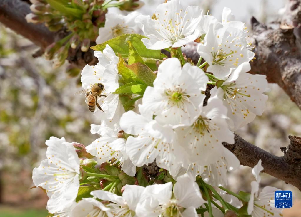 4月19日,在秦皇島市山海關區石河鎮一處櫻桃園,蜜蜂落在鮮花上采蜜。