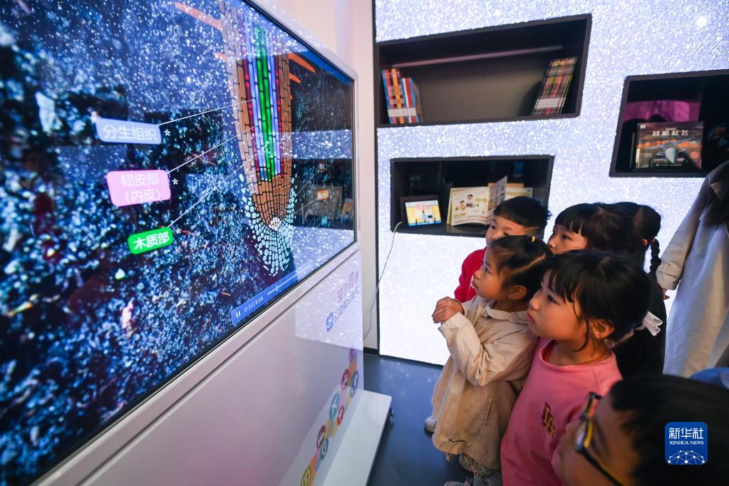 4月21日,在嘉興市圖書館元宇宙閱讀體驗館,小朋友們在老師的幫助下學習動植物知識。