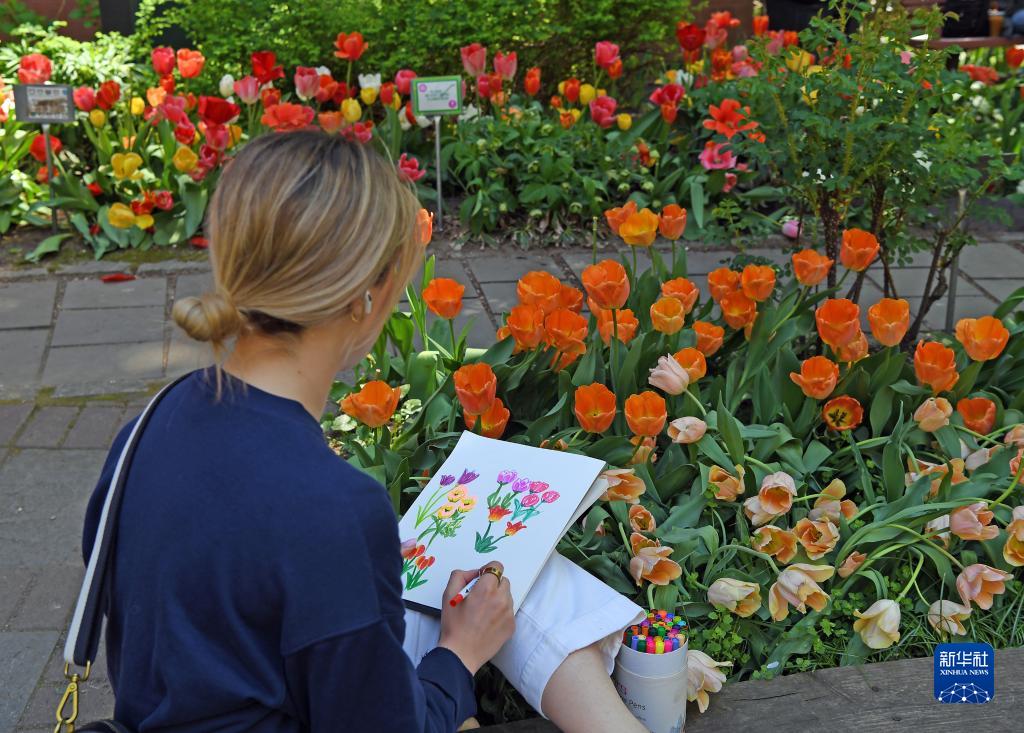 4月20日,在美國紐約的一處花園,一名女子在盛開的郁金香旁寫生。