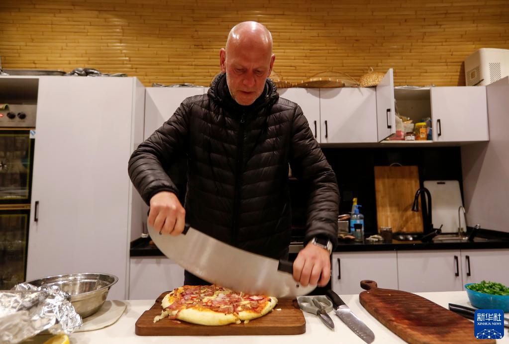 阿明在民宿的廚房內為客人切披薩(3月23日攝)。
