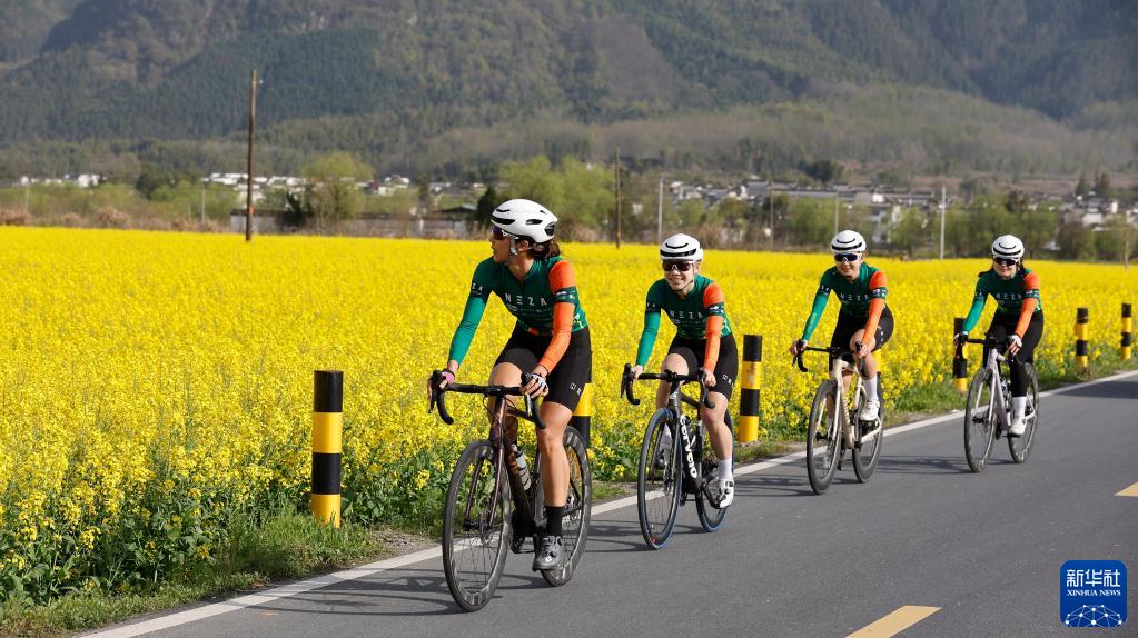 謝敏儀(左一)和隊友在黟縣鄉間道路上進行騎行練習(3月26日攝)。