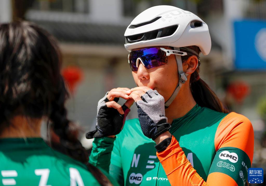謝敏儀參加女子公路自行車賽精英組比賽時(shí),在兩賽段間休整(3月26日攝)。