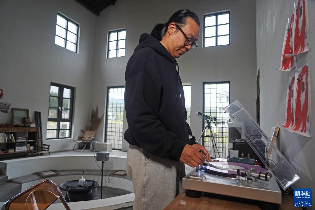 劉龍在民宿里用唱片機播放音樂(3月29日攝)。