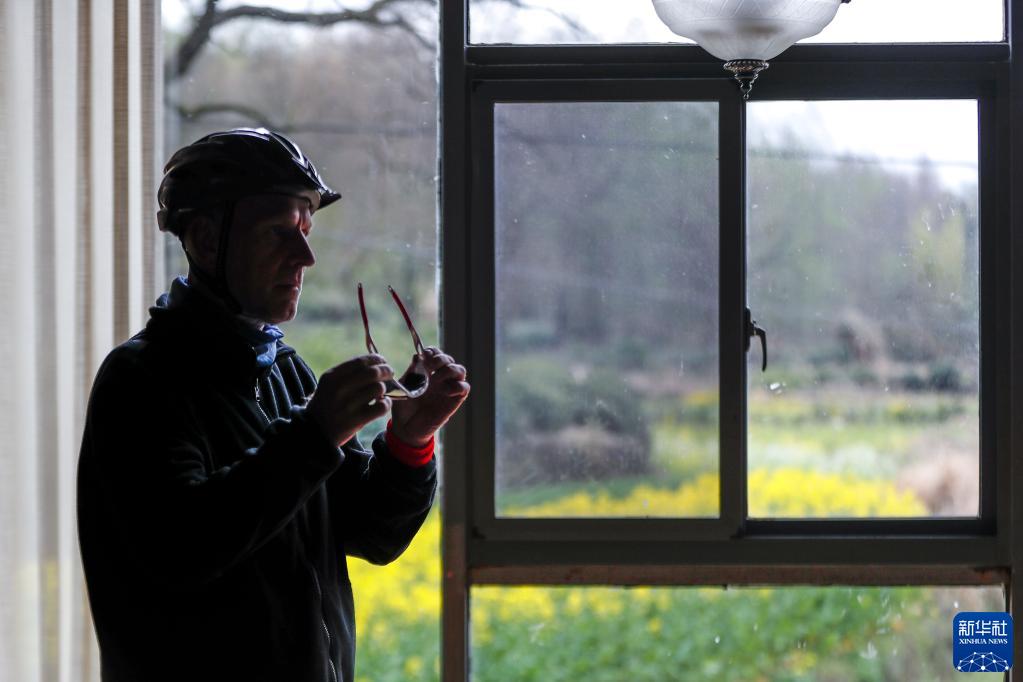 阿明在出門鍛煉前佩戴騎行眼鏡(3月23日攝)。