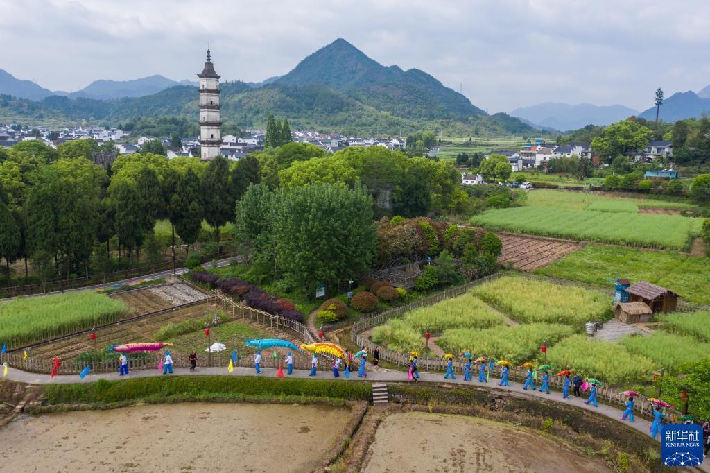 4月21日,“嚴州蝦燈”展演隊伍行走在建德市大慈巖鎮(zhèn)新葉古村的田野中(無人機照片)。