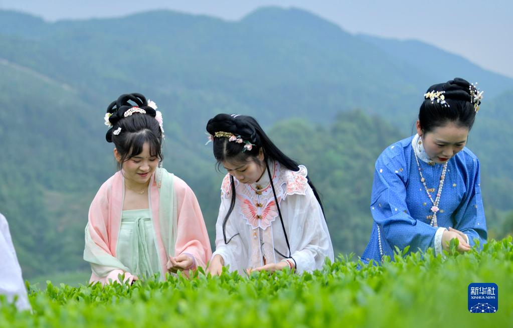 4月21日,身著傳統服裝的游客在宣恩縣伍家臺村茶園體驗采茶。