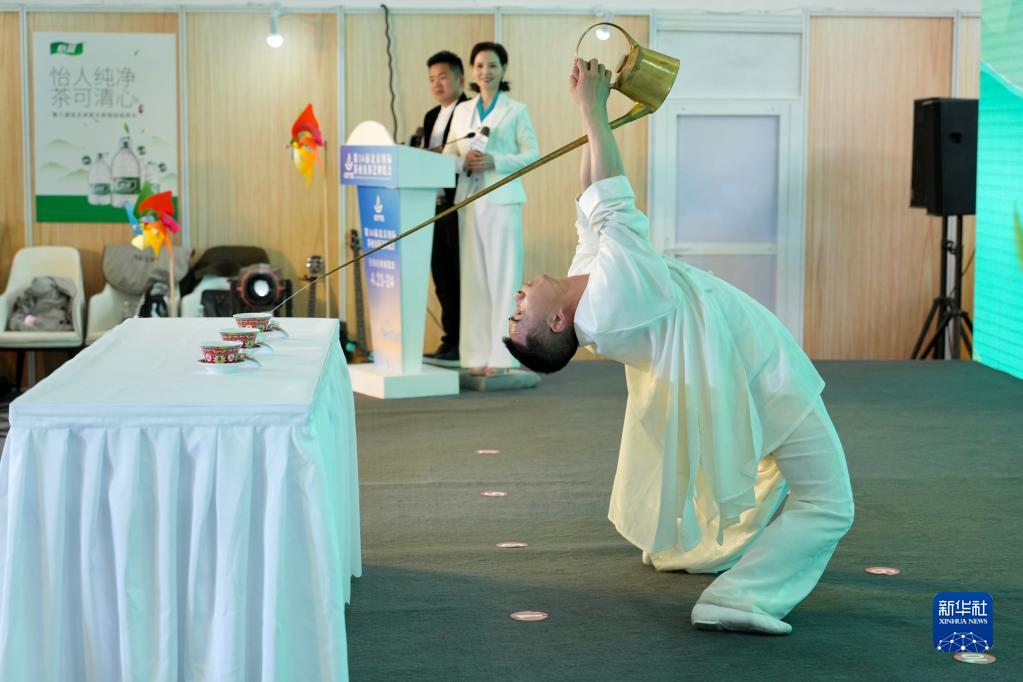 4月21日,在北京茶博會“春茶臨京城 共品非遺茶”活動上,工作人員表演長嘴壺技藝。