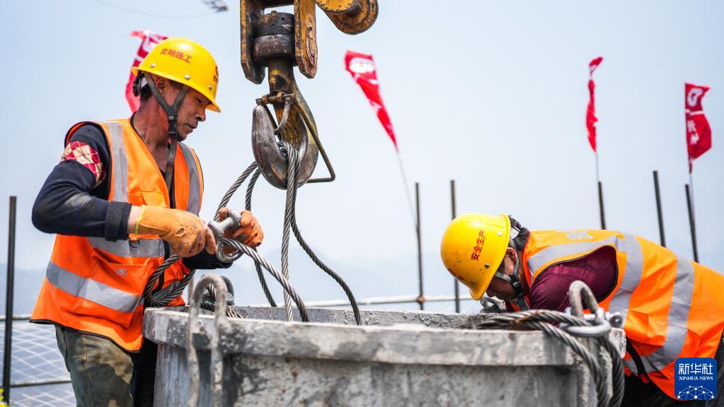 4月21日,工人在花江峽谷大橋6號主塔上進行施工。