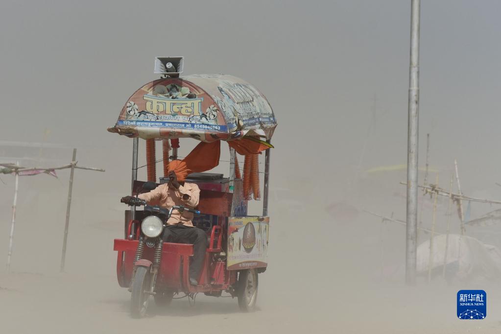4月18日,在印度北方邦普拉亞格拉杰,一名男子冒著風沙出行。
