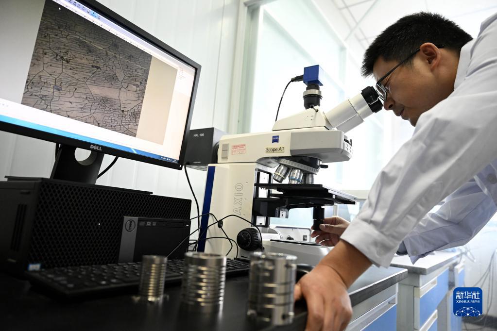 4月19日,在中科院合肥物質科學研究院,固體物理研究所內耗與固體缺陷研究部實驗師劉旺利用光學顯微鏡分析阻尼合金的微觀界面結構。