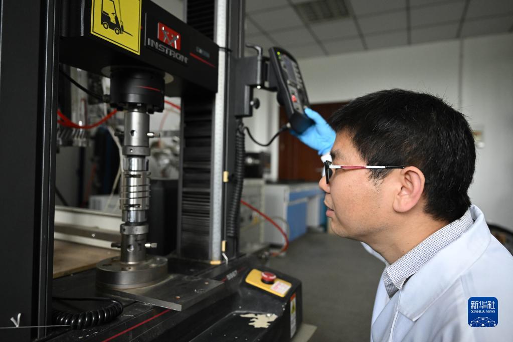 4月19日,在中科院合肥物質科學研究院,固體物理研究所內耗與固體缺陷研究部研究員蔣衛斌在測量減振彈簧的力學強度。