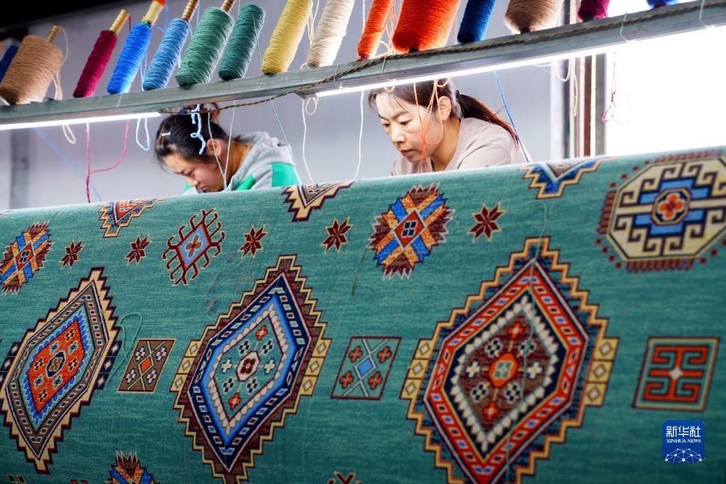 4月22日,在惠民縣辛店鎮“惠民工坊”,工作人員在編織地毯。