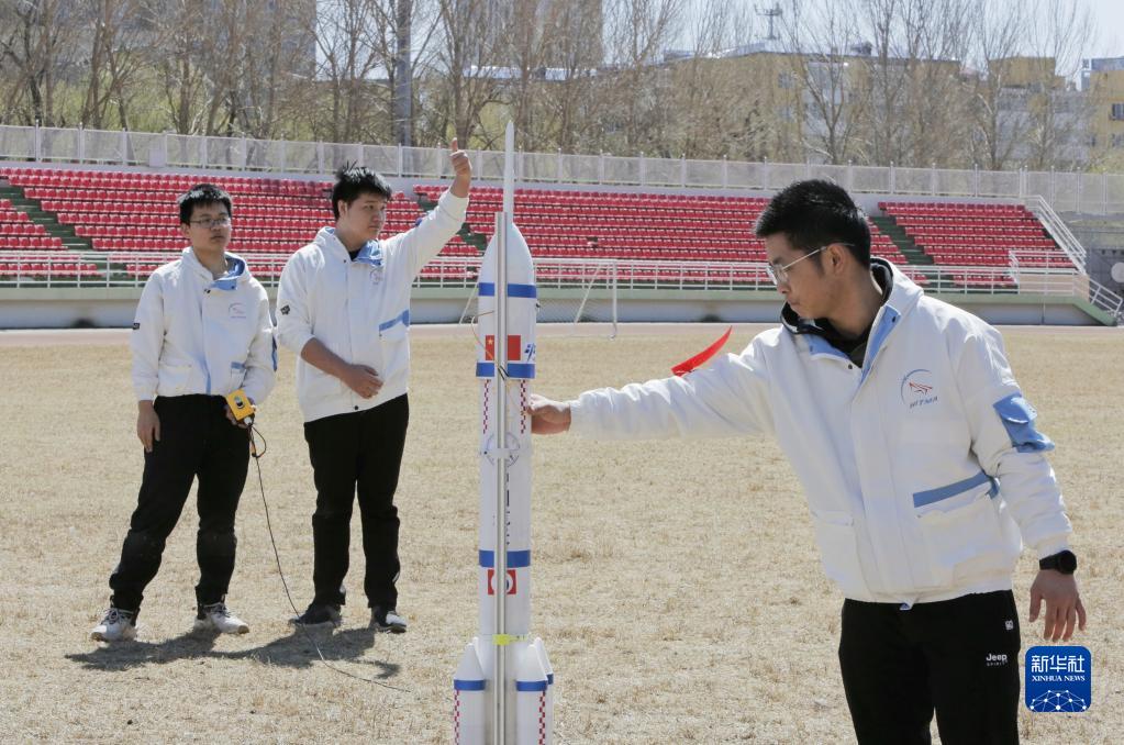 4月22日,在哈爾濱工業大學體育場,航模協會的學生在航模點火發射前倒計時。