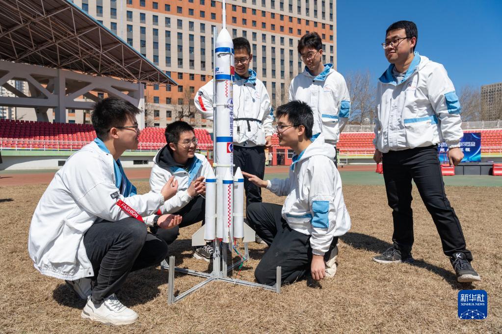 4月22日,在哈爾濱工業大學體育場,航模協會的學生在航模點火發射前進行討論。