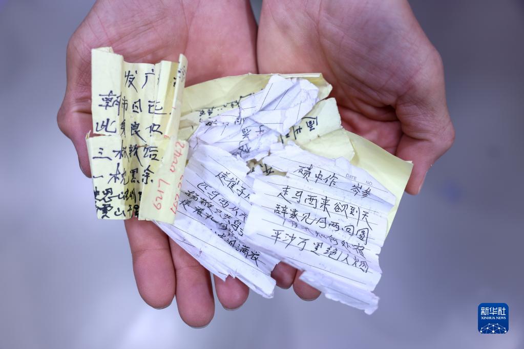朱彥軍展示自己為了背誦詩詞抄錄的便簽(4月12日攝)。新華社記者 劉金海 攝