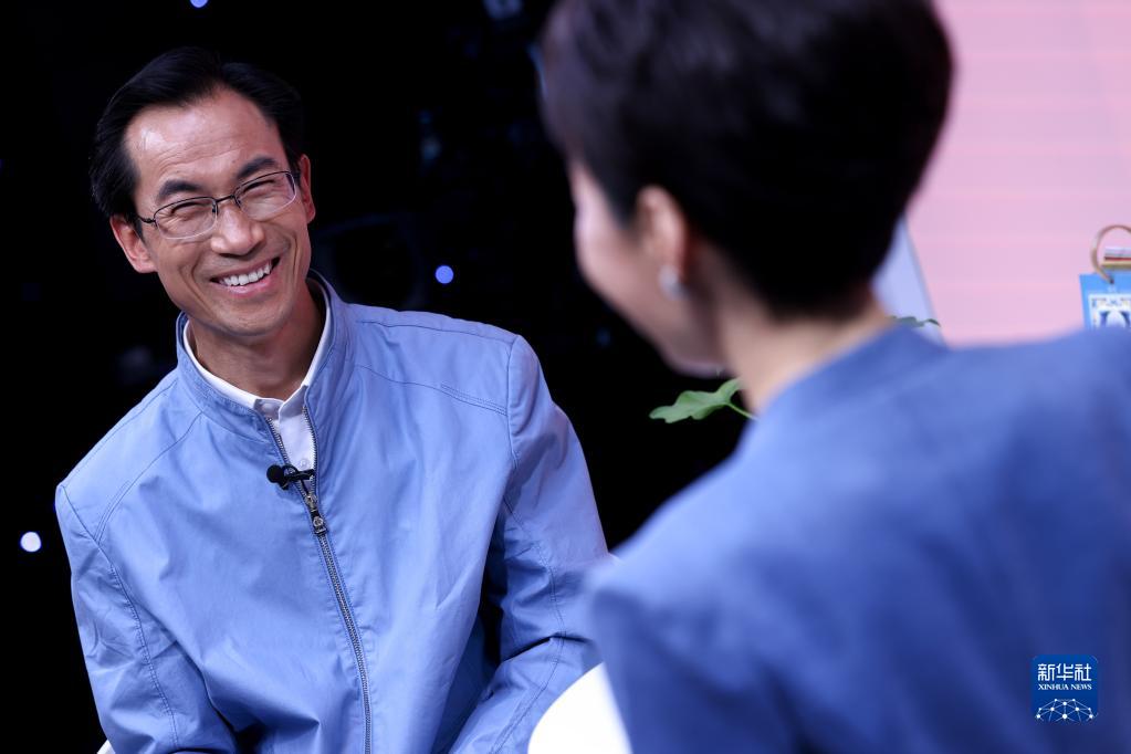 4月12日,在中國教育電視臺一處演播室,朱彥軍(左)受邀參加《育見》欄目關于“世界讀書日”系列訪談的錄制。新華社記者 劉金海 攝