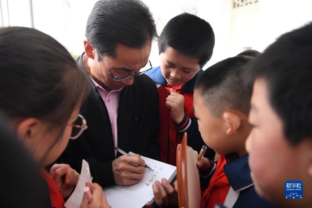 在靜寧縣城關小學,朱彥軍在孩子們的筆記本上書寫詩詞,鼓勵孩子們熱愛閱讀(4月10日攝)。新華社記者 陳斌 攝