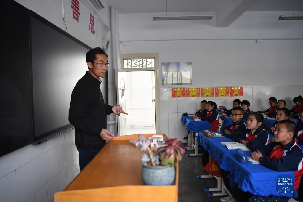 朱彥軍在靜寧縣城關小學與孩子們交流詩詞和閱讀心得(4月10日攝)。新華社記者 陳斌 攝