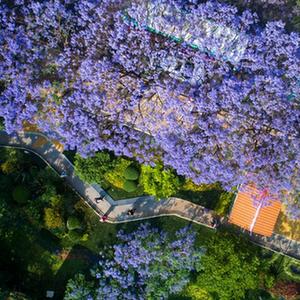近日,位于云南省昆明市教場中路的藍花楹綻放,吸引市民和游客前來拍照打卡。