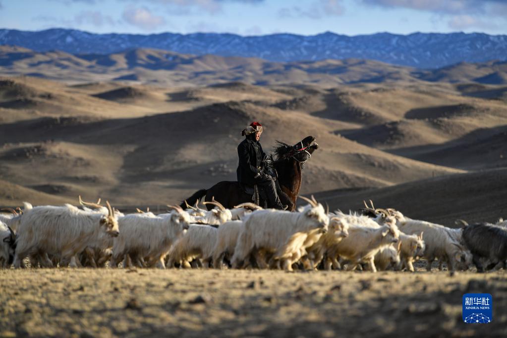 牧歸時分,哈布得拉什么騎馬趕著羊群行進在春草場上(4月12日攝)。