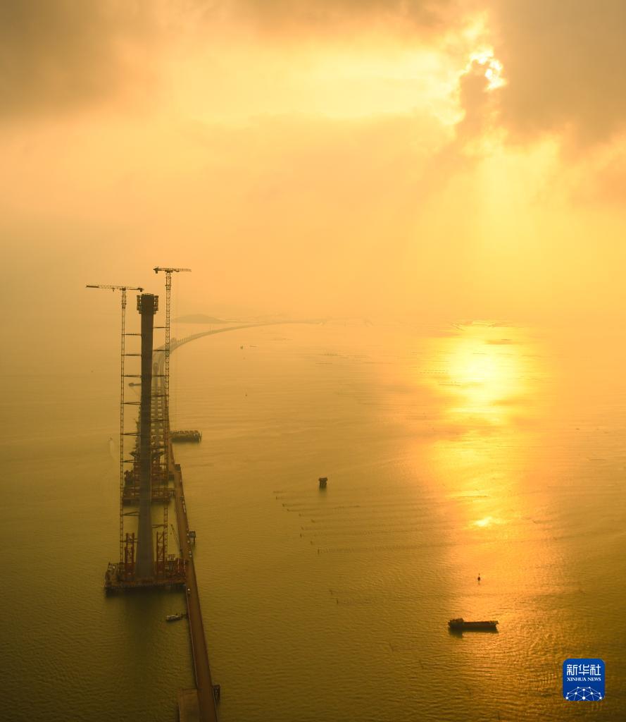 這是4月17日拍攝的夕陽下的黃茅海跨海通道黃茅海大橋西塔。