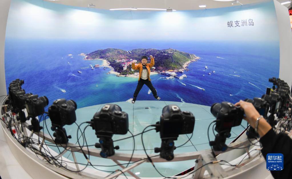4月22日,一名小朋友在海南館體驗環繞拍攝。