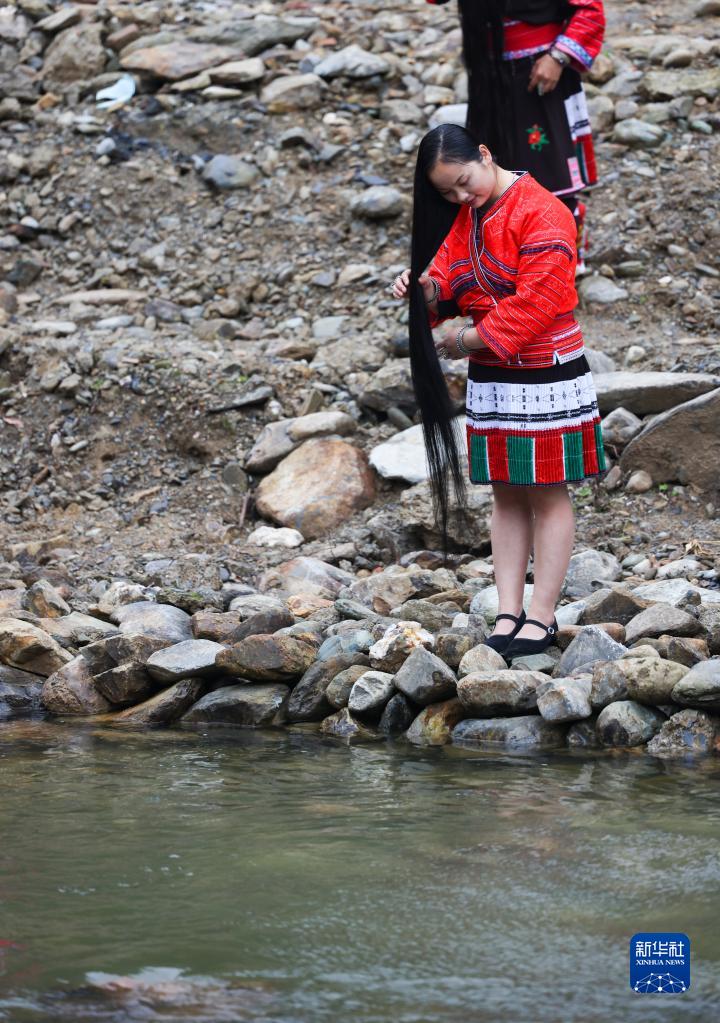 當日是農(nóng)歷三月初三,廣西桂林市龍勝各族自治縣黃洛瑤寨舉行“三月三龍脊長發(fā)節(jié)”活動,吸引游客前來參觀游覽。黃洛瑤寨的紅瑤族婦女有世代相傳的蓄發(fā)習俗,平均頭發(fā)長度達1.7米,最長的有2.72米。