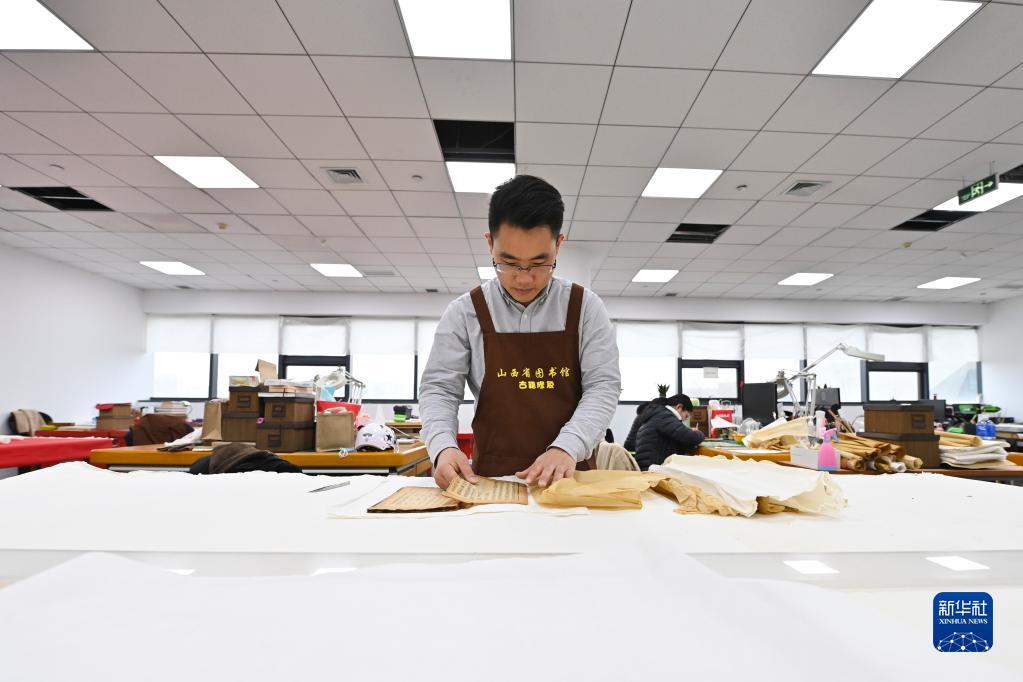 程文濤在山西省圖書館古籍修復(fù)中心內(nèi)配紙(4月21日攝)。