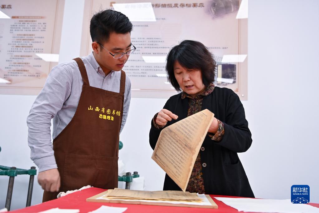 在山西省圖書(shū)館古籍修復(fù)中心,程文濤和修復(fù)導(dǎo)師邢雅梅(右)交流(4月21日攝)。