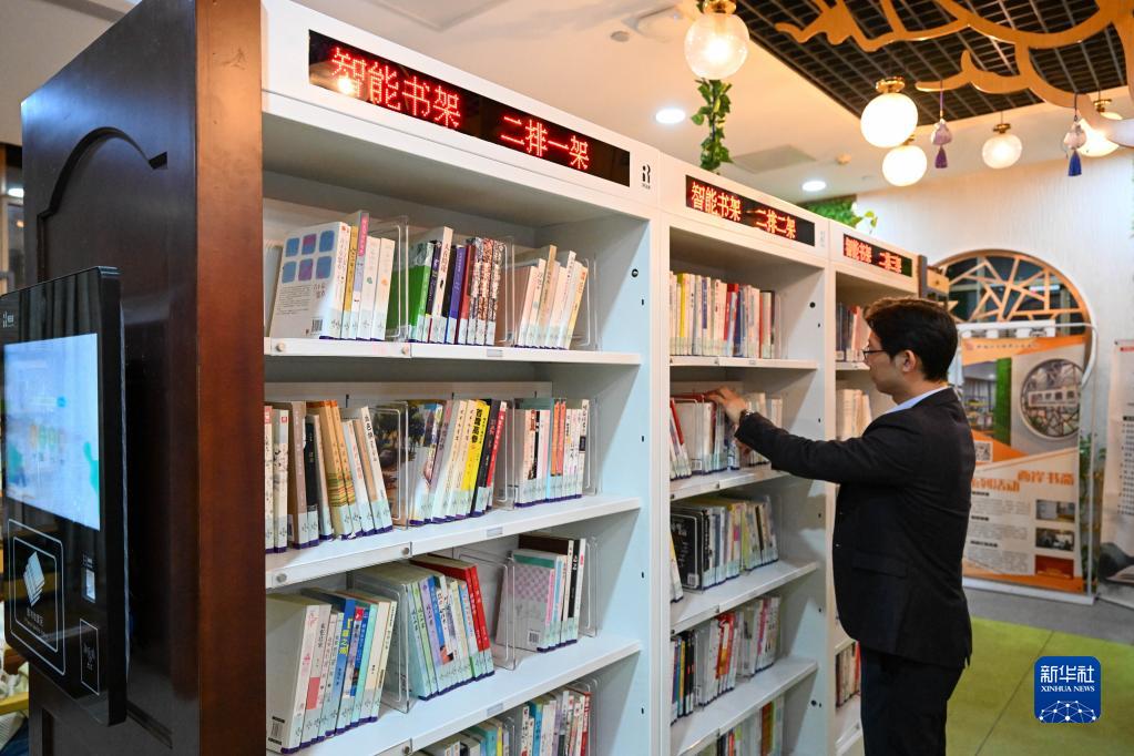 在天津市河西區新梅江文體中心西岸書齋,工作人員將圖書放置在智能書架上方便讀者快速檢索(4月19日攝)。