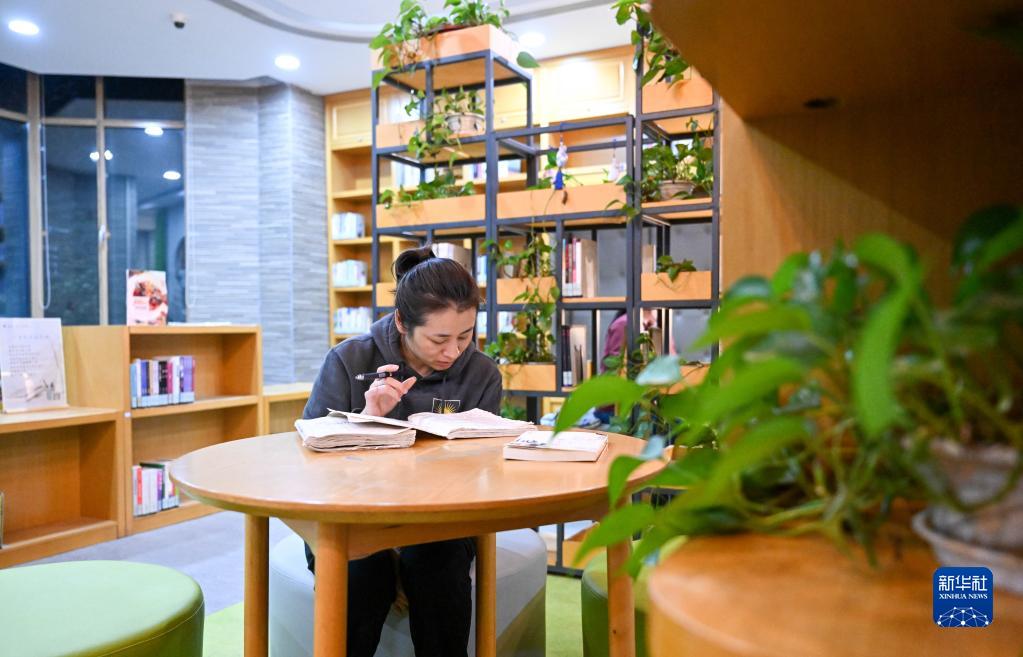 在天津市河西區(qū)新梅江文體中心西岸書齋,讀者在閱覽室內(nèi)進行夜間延時閱讀(4月19日攝)。