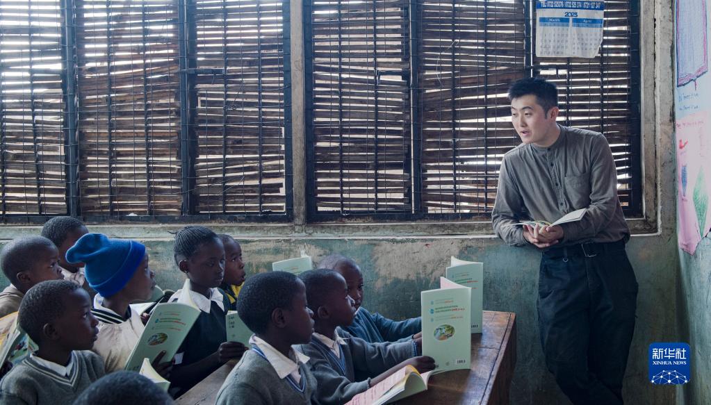 4月19日,在肯尼亞內羅畢馬薩雷貧民區的一所小學,劉宜孟翰為孩子們講解書本內容。