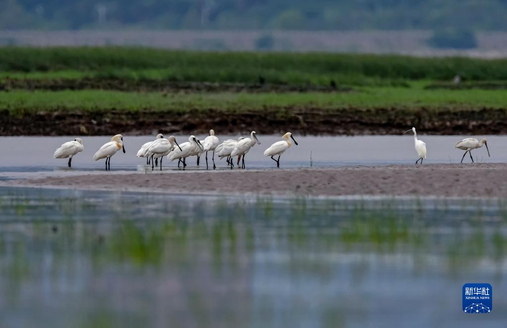 在閩江河口國家濕地公園里,一群國家一級保護野生動物黑臉琵鷺在濕地里覓食(4月21日攝)。