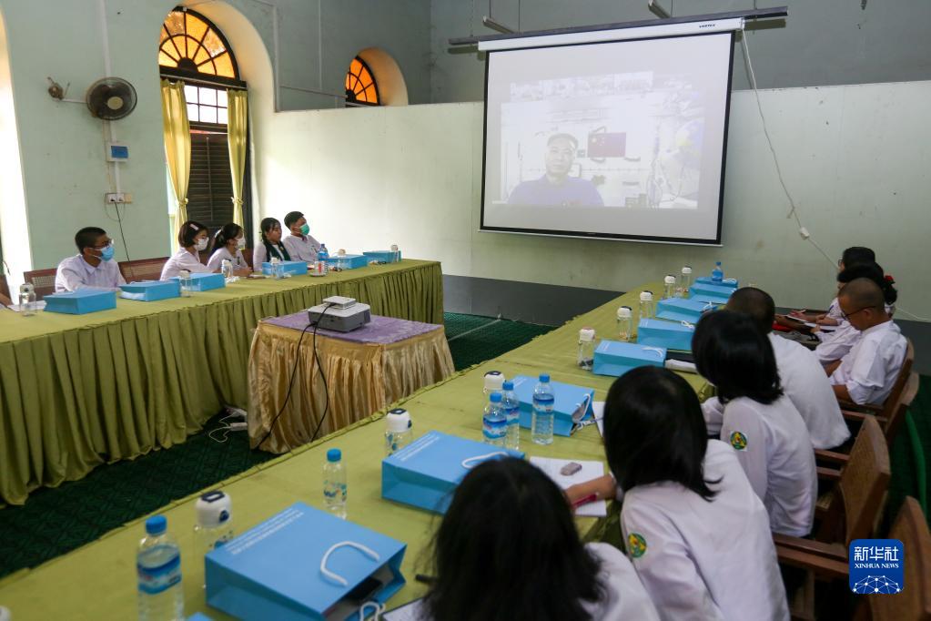 這是4月20日在緬甸仰光一所高中拍攝的“天宮對話”活動線上課堂現場。
