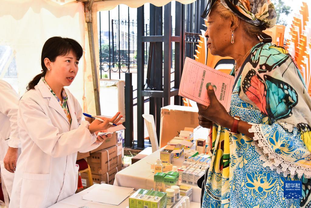 4月20日,醫(yī)療隊(duì)成員在喀麥隆首都雅溫得的義診活動(dòng)現(xiàn)場(chǎng)為病患發(fā)放免費(fèi)藥物。