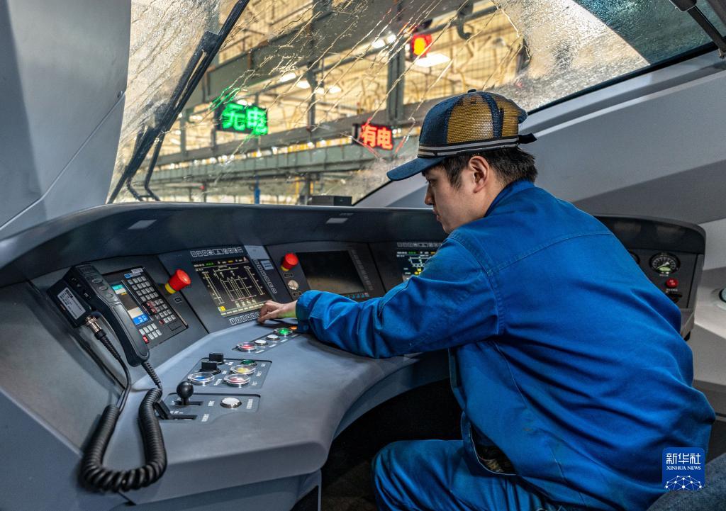 4月22日,在沈陽動車段沈陽北動車運用所,技術人員對列車雨刷器工作狀態進行確認。