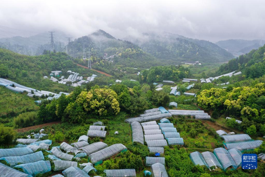 4月23日在杭州市臨安區(qū)錦南街道上甘村櫻桃谷拍攝的櫻桃大棚(無人機(jī)照片)。