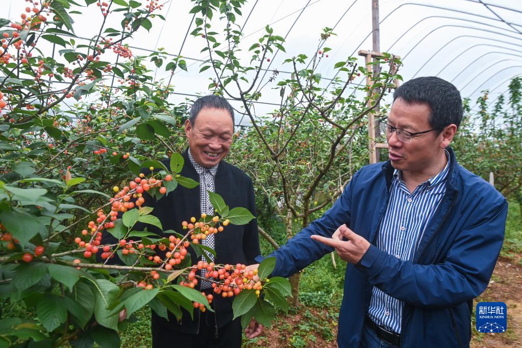 4月23日,在杭州市臨安區錦南街道上甘村的櫻桃大棚內,種植戶陳元昌(左)聽農技專家現場指導櫻桃種植。
