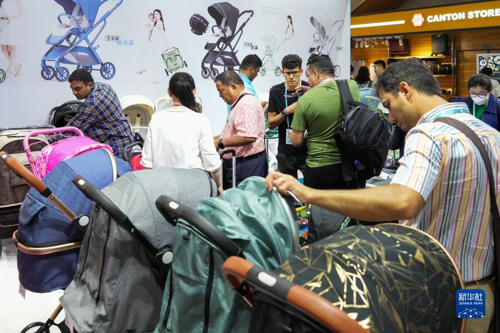 4月23日,采購商在第133屆廣交會二期孕嬰童展區了解童車產品。