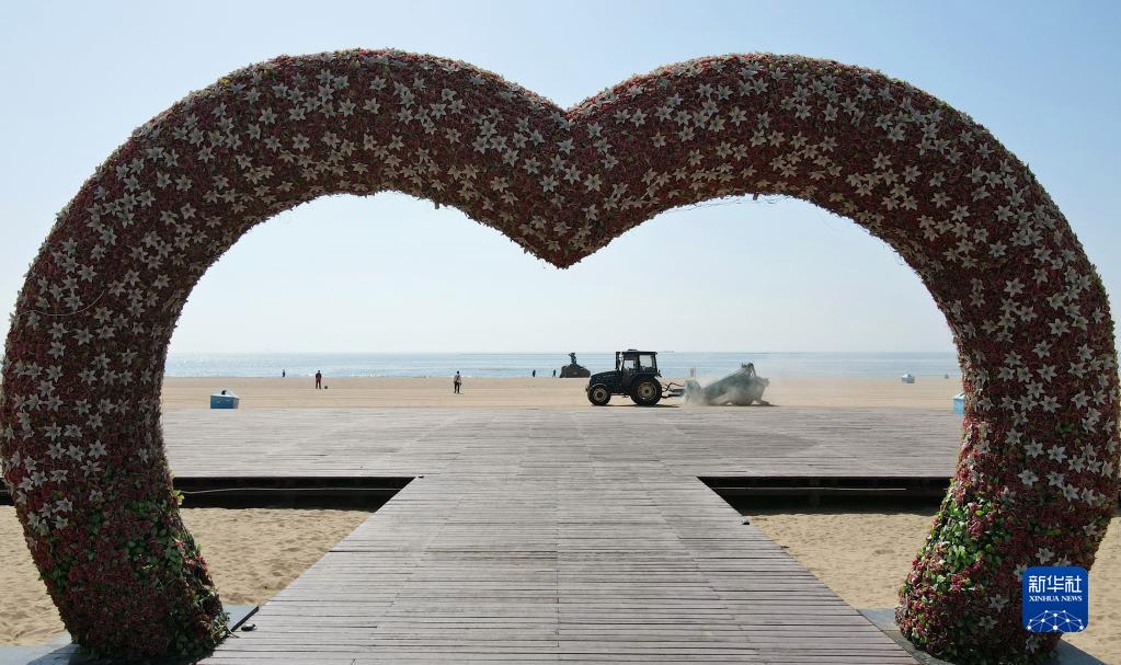 近日,旅游勝地河北省秦皇島市各浴場的工人開始對浴場的沙灘進行整理,精篩細沙,檢修旅游設備,準備迎接八方來客。