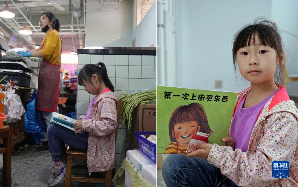 拼版照片:左圖為在奎照路菜市場(chǎng),6歲的衷欣怡在父母的蔬菜攤位上閱讀從菜場(chǎng)書(shū)屋借來(lái)的繪本;右圖為衷欣怡展示她喜歡的繪本故事書(shū)(4月20日攝)。