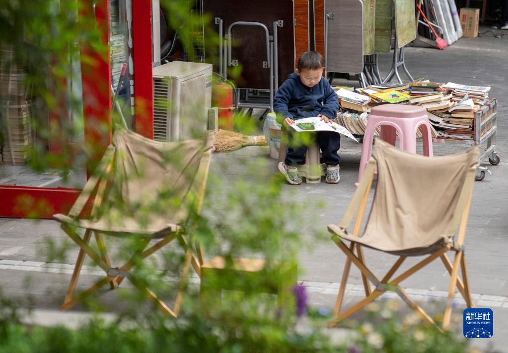 4月22日,一名小朋友在南京市一家二手書攤讀書。