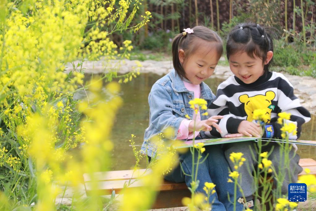 4月21日,在山東省高密市密水街道中心幼兒園,孩子們在校園里讀繪本故事。