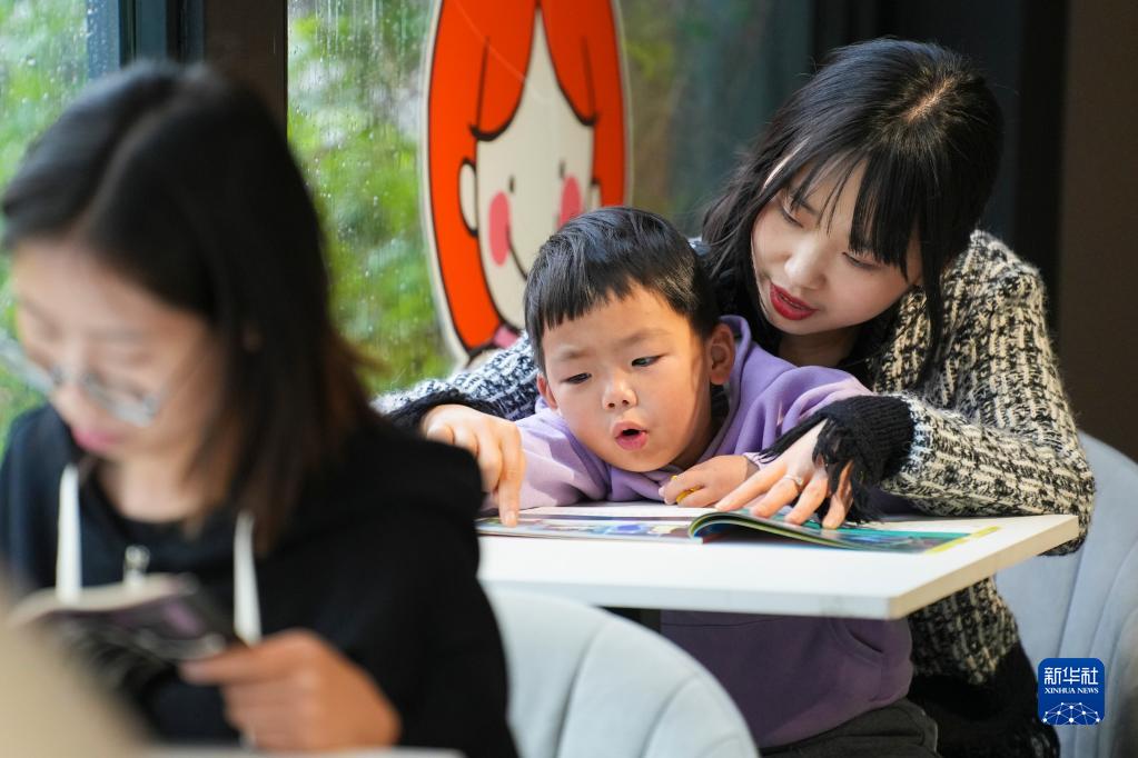 4月23日,在浙江省湖州市德清縣鐘管鎮(zhèn)“干山小鎮(zhèn)農(nóng)家書(shū)屋”,一名小朋友在大人的陪伴下讀書(shū)。