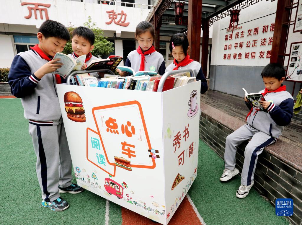 4月21日,在江蘇省蘇州市胥江中心小學校,學生在課間翻閱“閱讀點心車”上的圖書。