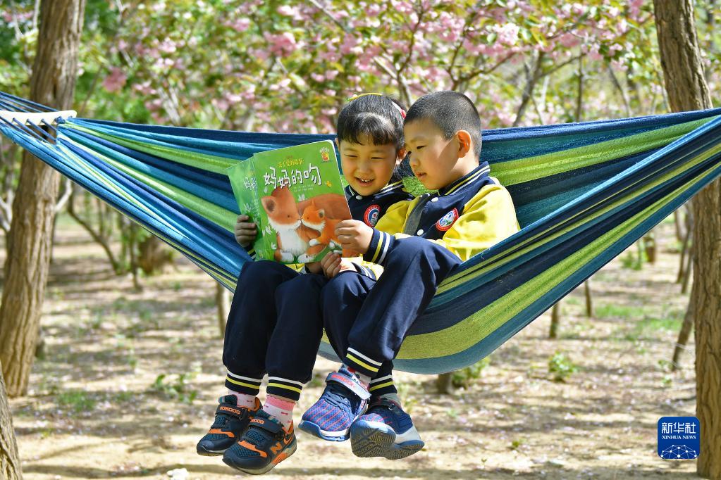 4月20日,山東省煙臺市福山區(qū)清洋街道中心幼兒園的小朋友在夾河生態(tài)園閱讀繪本。