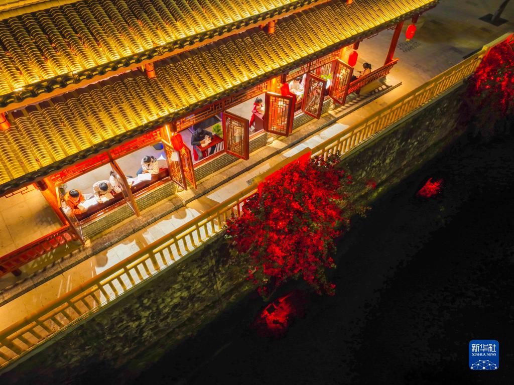 4月20日晚,人們在廣西金秀瑤族自治縣金秀鎮榮興社區24小時智慧書屋內讀書(無人機照片)。